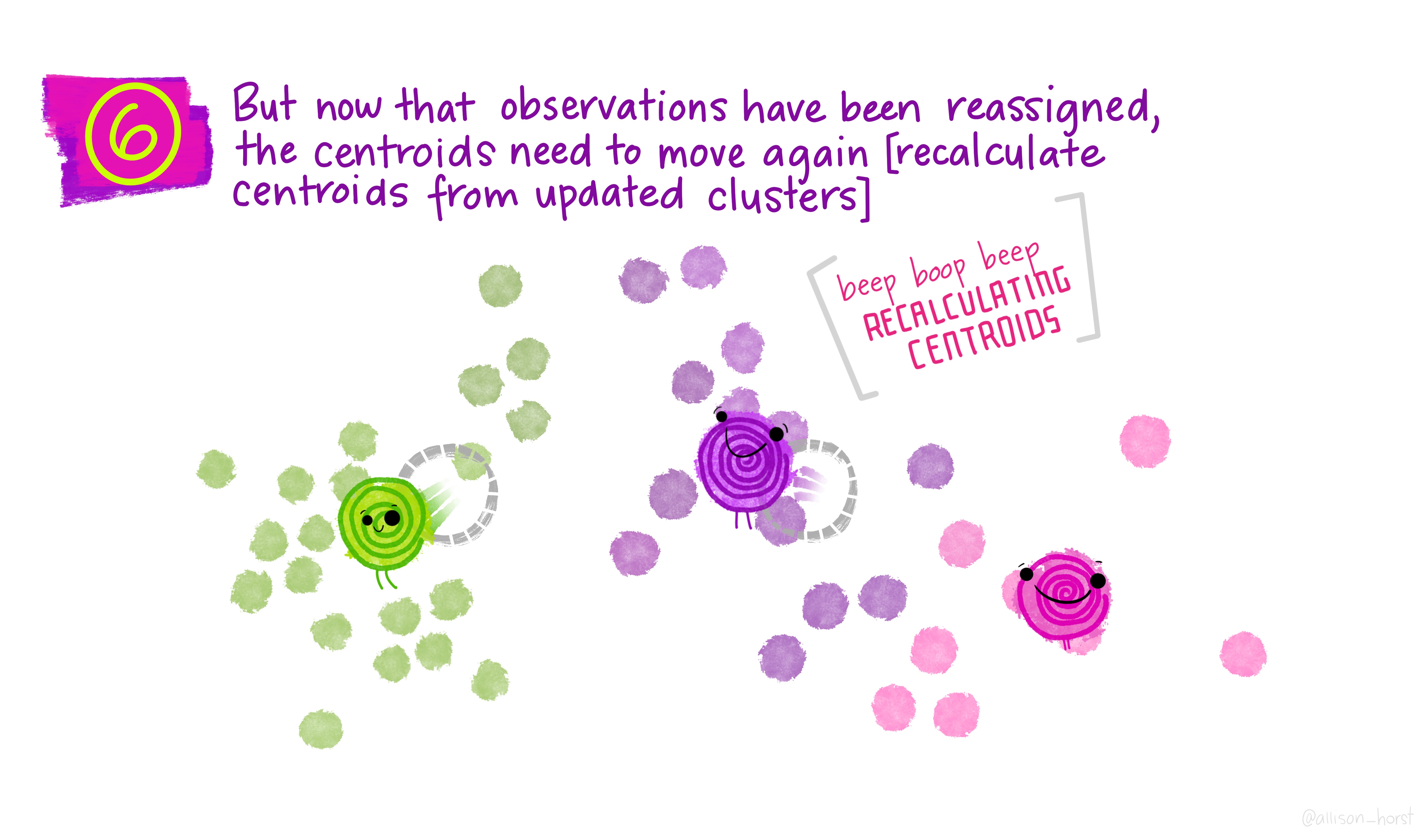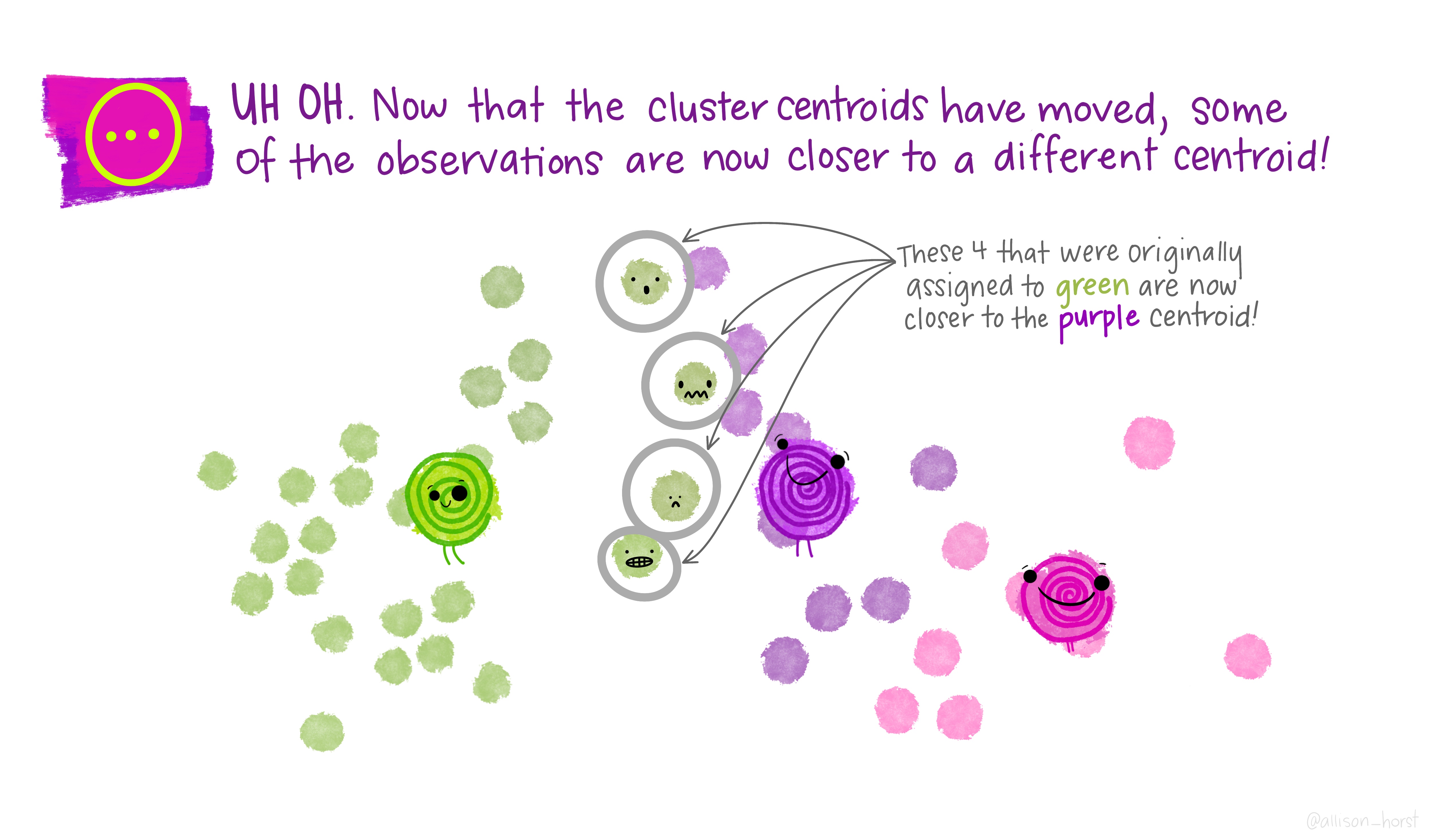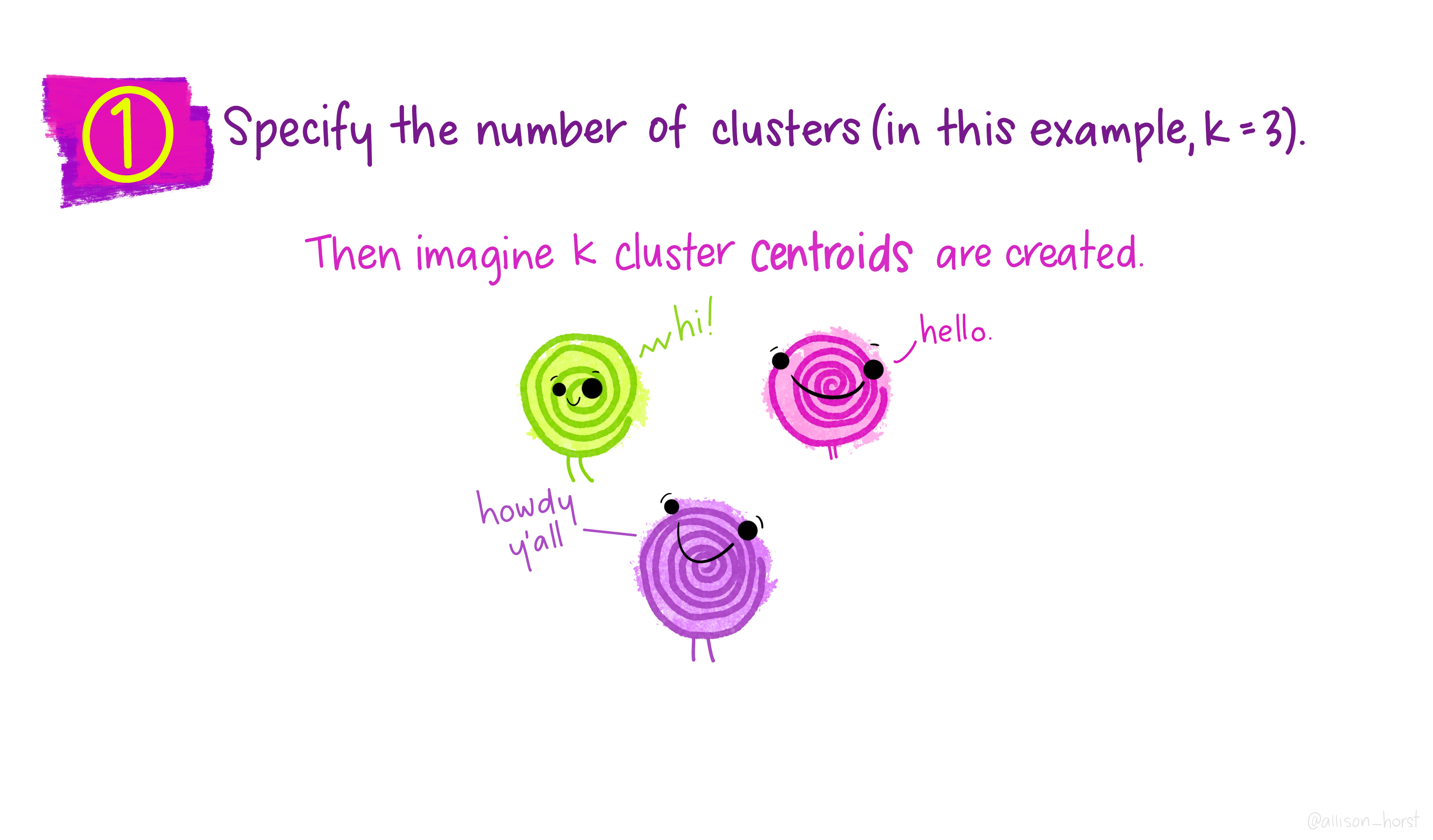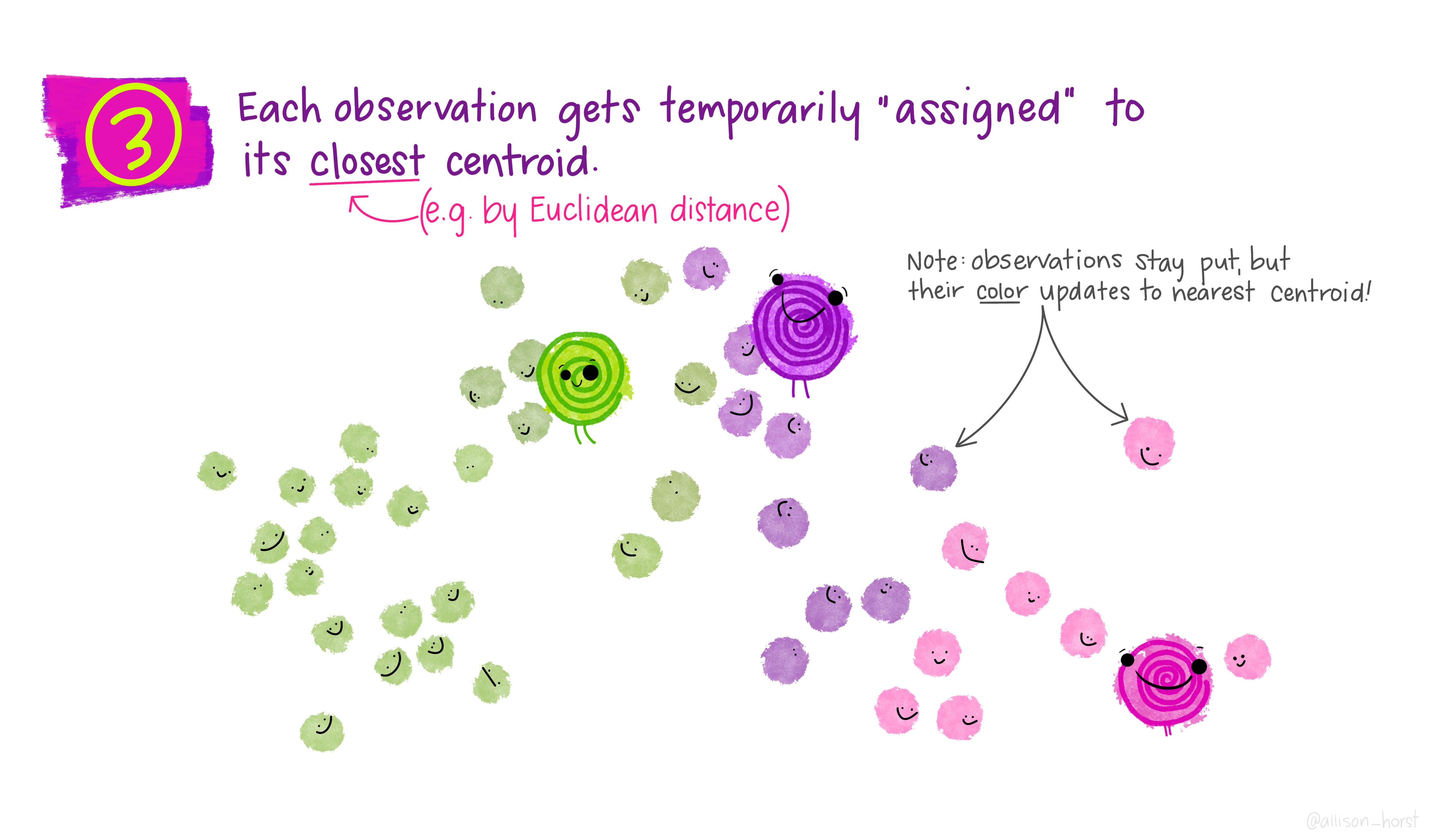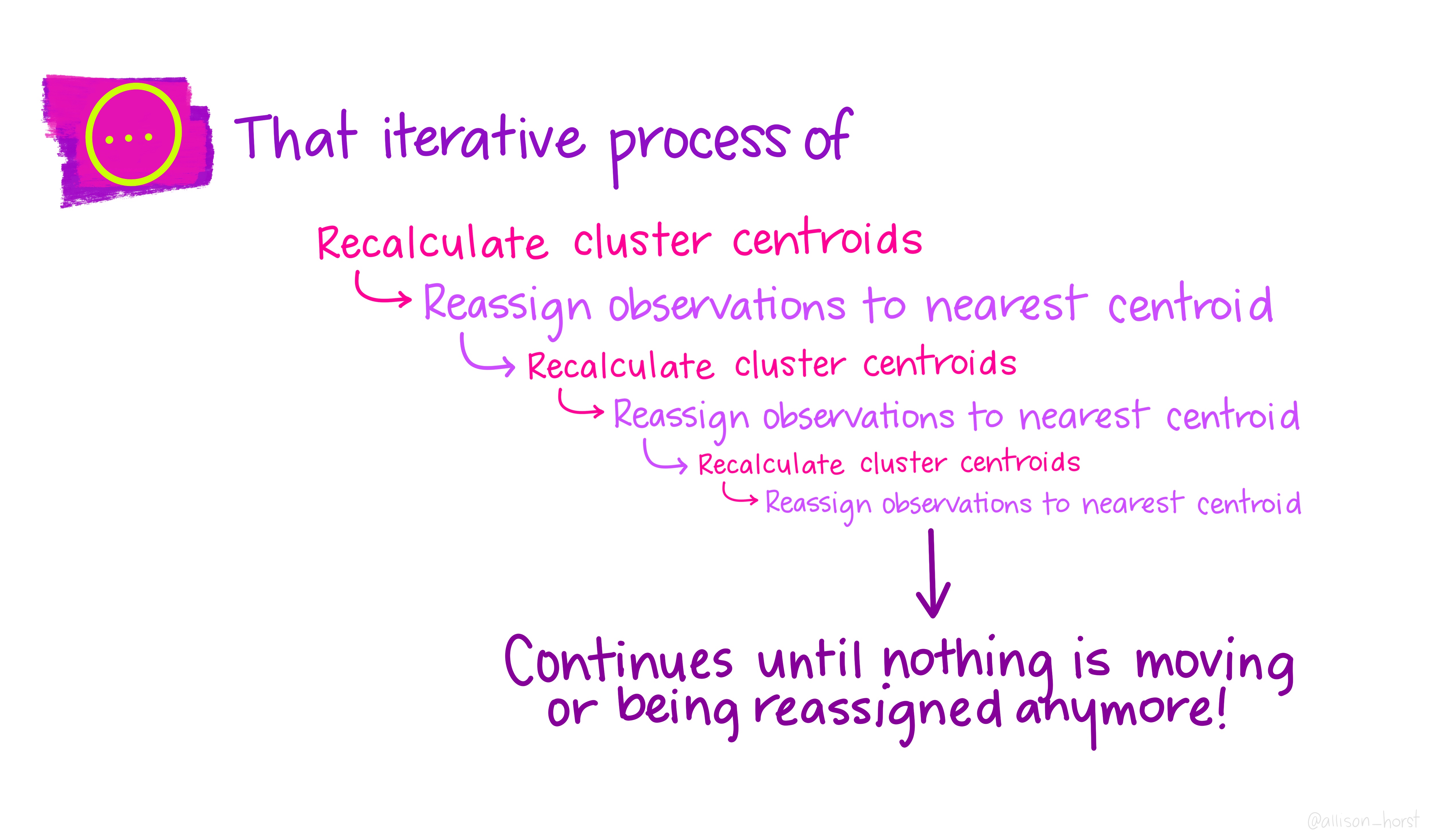 class: center, middle, title-slide # Clustering ## AU STAT-427/627 ### Emil Hvitfeldt ### 2021-06-05 --- <div style = "position:fixed; visibility: hidden"> `$$\require{color}\definecolor{orange}{rgb}{1, 0.603921568627451, 0.301960784313725}$$` `$$\require{color}\definecolor{blue}{rgb}{0.301960784313725, 0.580392156862745, 1}$$` `$$\require{color}\definecolor{pink}{rgb}{0.976470588235294, 0.301960784313725, 1}$$` </div> <script type="text/x-mathjax-config"> MathJax.Hub.Config({ TeX: { Macros: { orange: ["{\\color{orange}{#1}}", 1], blue: ["{\\color{blue}{#1}}", 1], pink: ["{\\color{pink}{#1}}", 1] }, loader: {load: ['[tex]/color']}, tex: {packages: {'[+]': ['color']}} } }); </script> <style> .orange {color: #FF9A4D;} .blue {color: #4D94FF;} .pink {color: #F94DFF;} </style> # Clustering This is a case of .orange[unsupervised learning] We are working with .blue[unlabeled data] --- # Unsupervised Learning - Clustering - Anomaly Detection - Dimensionality Reduction - Association Rules We are trying to find patterns and/or structure in the data --- # Unsupervised Learning The main characteristic for unsupervised learning is that we have .blue[unlabeled data] So far when working with supervised learning we have had a response variable `\(Y\)` and some predictors variables `\(X\)` This time we only have `\(X\)` Our goal is to see if there is anything we can get out of this information --- # Clustering Trying to divide/partition the `\(n\)` observations into several sub-groups/clusters How do we do this? --- # Centroid-based Clustering .center[  ] --- # Density-based Clustering .center[  ] --- # Distribution-based Clustering .center[  ] --- # Hierarchical Clustering .center[  ] --- ## Uses of Clustering - Semi-Supervised Learning - EDA - Pre-processing - Clusters as Analysis --- # Semi-Supervised Learning If we have class labels on *some* of the objects, we can apply unsupervised clustering, then let the clusters be defined by their class enrichment of labeled objects. A word of caution for this approach: Just because a clustering structure doesn't align with known labels doesn't mean it is "wrong". It could be capturing a different (true) aspect of the data than the one we have labels for. --- # EDA Sometimes clustering is applied as a first exploratory step, to get a sense of the structure of the data. This is somewhat nebulous and usually involves eyeballing a visualization. --- # Pre-processing Clustering can be used to discover relationships in data that are undesirable, so that we can *residualize* or *decorrelate* the objects before applying an analysis. A great example of this is in genetics, where we have measurements of gene expression for several subjects. Typically, gene expression is most strongly correlated by race. If we cluster the subjects on gene expression, we can then identify unwanted dependence to remove from the data. --- # Clusters as analysis Sometimes, the assignment of cluster membership *is* the end goal of the study. For example: In the Enron corruption case in 2001, researchers created a network based on who emailed who within the company. They then looked at which clusters contained known conspirators and investigated the other individuals in those groups. In the early days of breast cancer genetic studies, researchers clustered known patients on genetic expression, which led to the discovery of different tumor types (e.g. Basal, Her-2, Luminal). These have later been clinically validated and better defined. --- # How are clusters found? One way is to define a geometry that is used to determine whether 2 points are close to each other Having the "distances" between points allows us to see if there are any points with a lot of "friends" --- # How are clusters found? We will focus .blue[K-means clustering] and .pink[Hierarchical clustering] Which are .blue[Centroid-based Clustering] and .pink[Hierarchical Clustering] respectively --- # Survey of many more clustering methods [A Comprehensive Survey of Clustering Algorithms](https://link.springer.com/article/10.1007/s40745-015-0040-1) by Dongkuan Xu & Yingjie Tian --- # K-Means Clustering A simple and elegant approach Intuitively easy to understand Does partitioning into K non-overlapping clusters --- # K-Means Clustering We let `\(C_1, ..., C_K\)` denote sets of indices of the observations in each cluster. For K-Means we have that the union of `\(C_1, ..., C_K\)` is equal to `\(1, ..., n\)` and that there is no overlap between the sets --- # K-Means Clustering We are trying to maximize/optimize something K-means states that we want to minimize the *within-cluster variation* `$$\underset{C_1, ..., C_K}{\text{minimize}}\left\{ \sum_{k=1}^K W(C_k) \right\}$$` This is a reasonable starting point. But we need to define `\(W\)` --- # K-Means Clustering The most common way is using *squared Euclidean distance* `$$W(C_k) = \dfrac{1}{|C_k|} \sum_{i, i' \in C_k}\sum_{j=1}^p(x_{ij} - x_{i'j})^2$$` here `\(|C_k|\)` denote the number of observations in the `\(k\)`th cluster --- # K-Means Clustering The variation is defined as the sum of all the pairwise squared euclidean distances between the observations within a cluster There is no closed-form solution to this since the function isn't smooth We have to find a way to walk through the different partitions to find a good one. HOWEVER!! Since we are working with partitions the number goes up VERY fast as `\(K^n\)` --- # K-Means Clustering 1. Randomly assign a number, from 1 to `\(K\)`, to each of the observations. These serve as initial cluster assignments for the observations. 2. iterate until the cluster assignments stop changing a. For each of the `\(K\)` clusters, compute the cluster *centroid*. The `\(k\)`th cluster centroid is the vector of the `\(p\)` feature means for the observations in the `\(k\)`th cluster. b. Assign each observation to the cluster whose centroid is .blue[closest] Here .blue[closest] is defined using Euclidean distance --- .center[  ] .footnote[Art by Alli