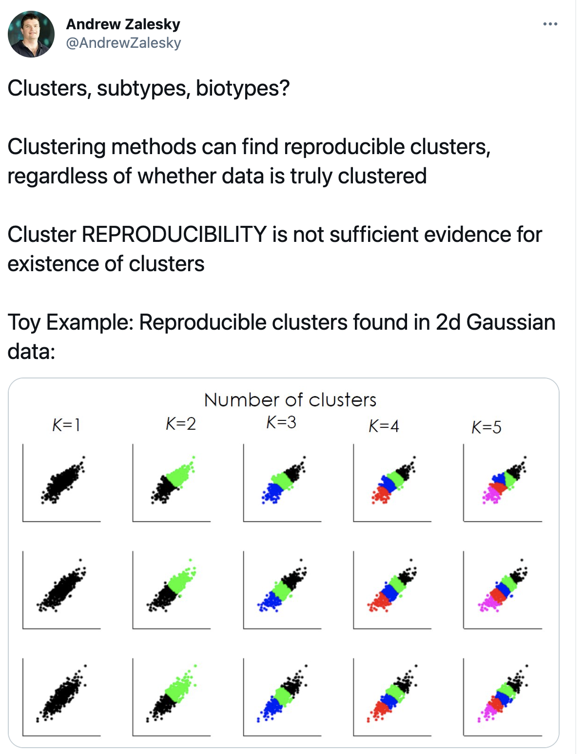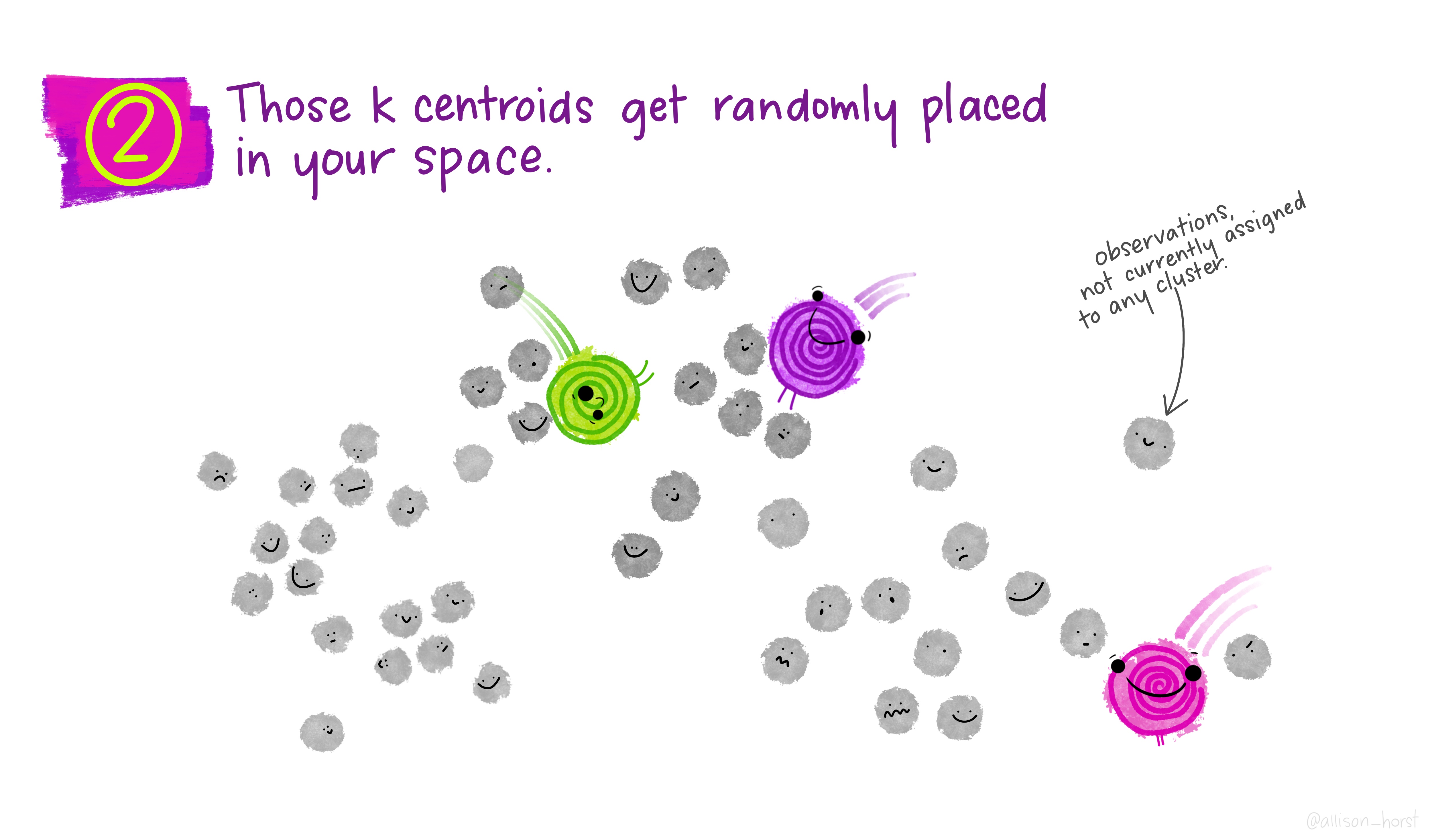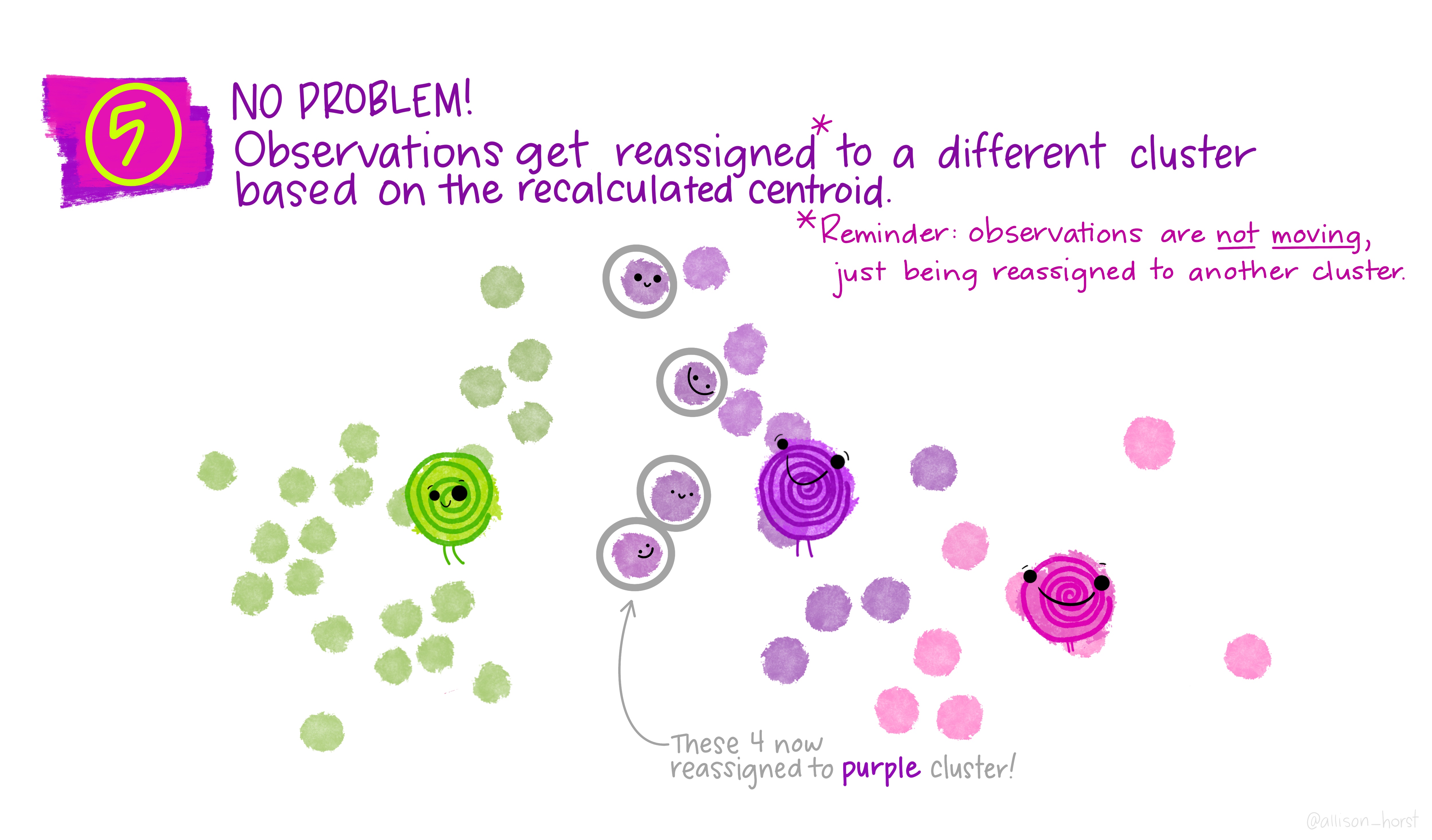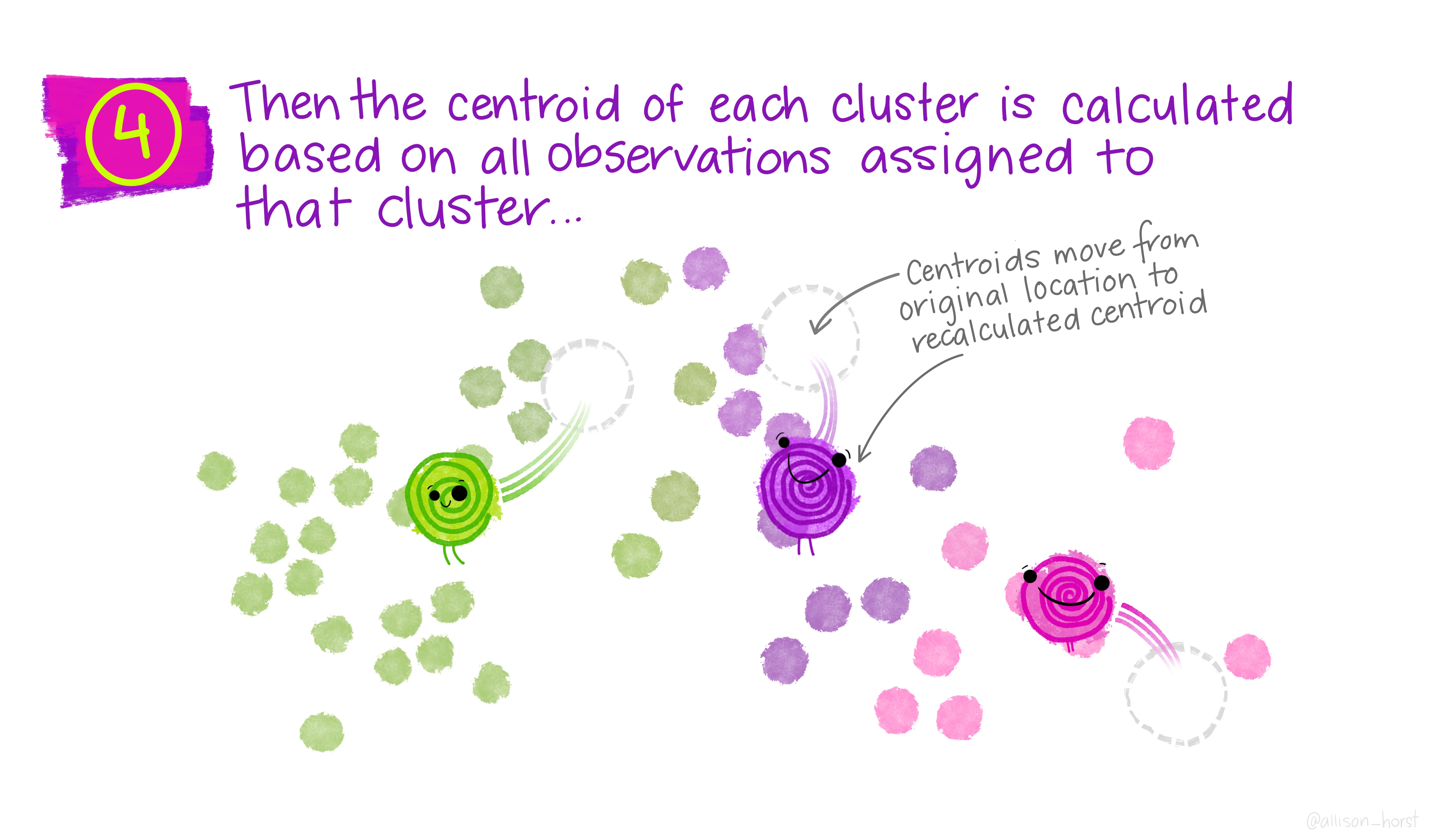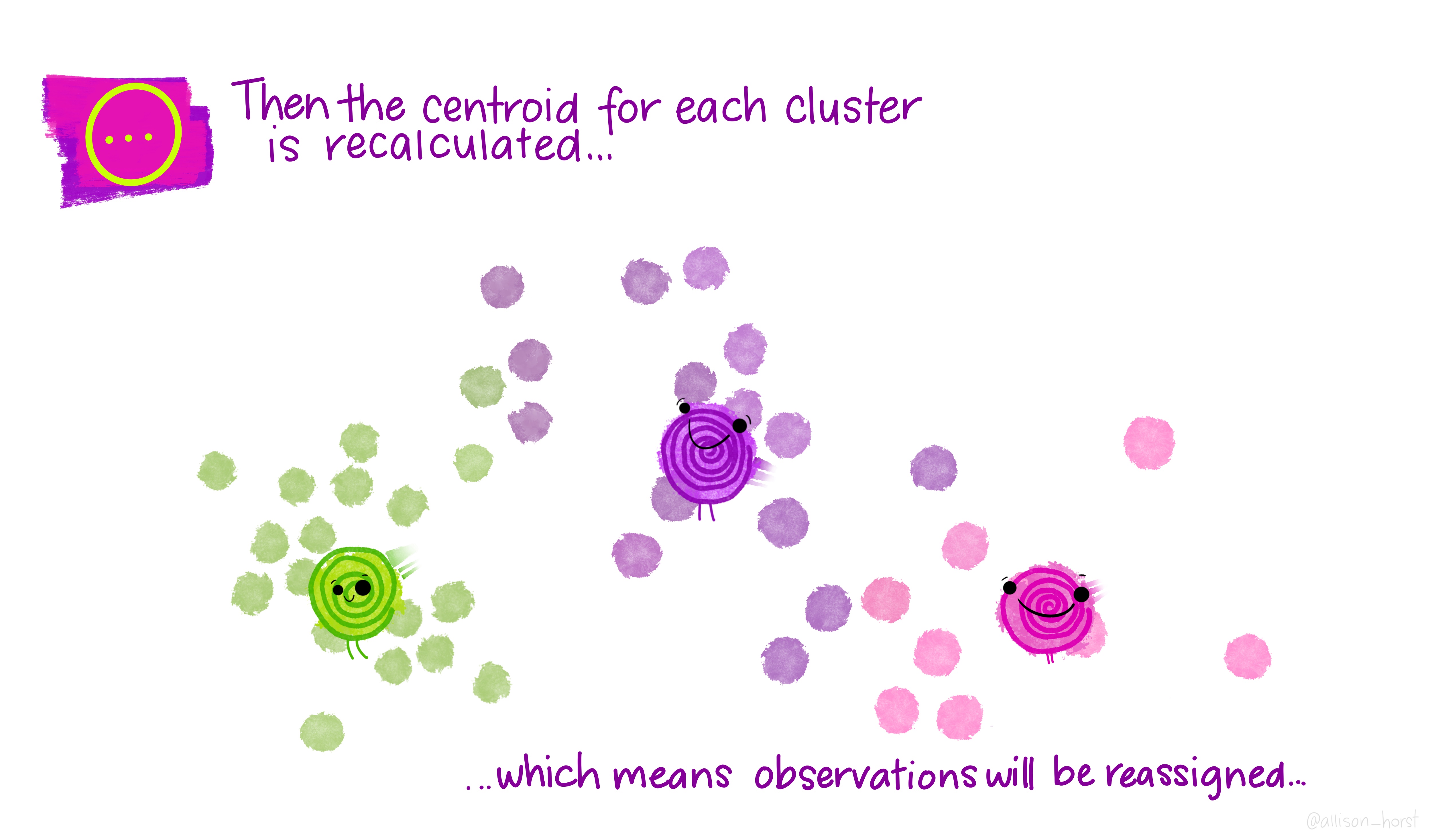 class: center, middle, title-slide # Clustering ## AU STAT-427/627 ### Emil Hvitfeldt ### 2021-06-05 --- <div style = "position:fixed; visibility: hidden"> `$$\require{color}\definecolor{orange}{rgb}{1, 0.603921568627451, 0.301960784313725}$$` `$$\require{color}\definecolor{blue}{rgb}{0.301960784313725, 0.580392156862745, 1}$$` `$$\require{color}\definecolor{pink}{rgb}{0.976470588235294, 0.301960784313725, 1}$$` </div> <script type="text/x-mathjax-config"> MathJax.Hub.Config({ TeX: { Macros: { orange: ["{\\color{orange}{#1}}", 1], blue: ["{\\color{blue}{#1}}", 1], pink: ["{\\color{pink}{#1}}", 1] }, loader: {load: ['[tex]/color']}, tex: {packages: {'[+]': ['color']}} } }); </script> <style> .orange {color: #FF9A4D;} .blue {color: #4D94FF;} .pink {color: #F94DFF;} </style> # Clustering This is a case of .orange[unsupervised learning] We are working with .blue[unlabeled data] --- # Unsupervised Learning - Clustering - Anomaly Detection - Dimensionality Reduction - Association Rules We are trying to find patterns and/or structure in the data --- # Unsupervised Learning The main characteristic for unsupervised learning is that we have .blue[unlabeled data] So far when working with supervised learning we have had a response variable `\(Y\)` and some predictors variables `\(X\)` This time we only have `\(X\)` Our goal is to see if there is anything we can get out of this information --- # Clustering Trying to divide/partition the `\(n\)` observations into several sub-groups/clusters How do we do this? --- # Centroid-based Clustering .center[  ] --- # Density-based Clustering .center[  ] --- # Distribution-based Clustering .center[  ] --- # Hierarchical Clustering .center[  ] --- ## Uses of Clustering - Semi-Supervised Learning - EDA - Pre-processing - Clusters as Analysis --- # Semi-Supervised Learning If we have class labels on *some* of the objects, we can apply unsupervised clustering, then let the clusters be defined by their class enrichment of labeled objects. A word of caution for this approach: Just because a clustering structure doesn't align with known labels doesn't mean it is "wrong". It could be capturing a different (true) aspect of the data than the one we have labels for. --- # EDA Sometimes clustering is applied as a first exploratory step, to get a sense of the structure of the data. This is somewhat nebulous and usually involves eyeballing a visualization. --- # Pre-processing Clustering can be used to discover relationships in data that are undesirable, so that we can *residualize* or *decorrelate* the objects before applying an analysis. A great example of this is in genetics, where we have measurements of gene expression for several subjects. Typically, gene expression is most strongly correlated by race. If we cluster the subjects on gene expression, we can then identify unwanted dependence to remove from the data. --- # Clusters as analysis Sometimes, the assignment of cluster membership *is* the end goal of the study. For example: In the Enron corruption case in 2001, researchers created a network based on who emailed who within the company. They then looked at which clusters contained known conspirators and investigated the other individuals in those groups. In the early days of breast cancer genetic studies, researchers clustered known patients on genetic expression, which led to the discovery of different tumor types (e.g. Basal, Her-2, Luminal). These have later been clinically validated and better defined. --- # How are clusters found? One way is to define a geometry that is used to determine whether 2 points are close to each other Having the "distances" between points allows us to see if there are any points with a lot of "friends" --- # How are clusters found? We will focus .blue[K-means clustering] and .pink[Hierarchical clustering] Which are .blue[Centroid-based Clustering] and .pink[Hierarchical Clustering] respectively --- # Survey of many more clustering methods [A Comprehensive Survey of Clustering Algorithms](https://link.springer.com/article/10.1007/s40745-015-0040-1) by Dongkuan Xu & Yingjie Tian --- # K-Means Clustering A simple and elegant approach Intuitively easy to understand Does partitioning into K non-overlapping clusters --- # K-Means Clustering We let `\(C_1, ..., C_K\)` denote sets of indices of the observations in each cluster. For K-Means we have that the union of `\(C_1, ..., C_K\)` is equal to `\(1, ..., n\)` and that there is no overlap between the sets --- # K-Means Clustering We are trying to maximize/optimize something K-means states that we want to minimize the *within-cluster variation* `$$\underset{C_1, ..., C_K}{\text{minimize}}\left\{ \sum_{k=1}^K W(C_k) \right\}$$` This is a reasonable starting point. But we need to define `\(W\)` --- # K-Means Clustering The most common way is using *squared Euclidean distance* `$$W(C_k) = \dfrac{1}{|C_k|} \sum_{i, i' \in C_k}\sum_{j=1}^p(x_{ij} - x_{i'j})^2$$` here `\(|C_k|\)` denote the number of observations in the `\(k\)`th cluster --- # K-Means Clustering The variation is defined as the sum of all the pairwise squared euclidean distances between the observations within a cluster There is no closed-form solution to this since the function isn't smooth We have to find a way to walk through the different partitions to find a good one. HOWEVER!! Since we are working with partitions the number goes up VERY fast as `\(K^n\)` --- # K-Means Clustering 1. Randomly assign a number, from 1 to `\(K\)`, to each of the observations. These serve as initial cluster assignments for the observations. 2. iterate until the cluster assignments stop changing a. For each of the `\(K\)` clusters, compute the cluster *centroid*. The `\(k\)`th cluster centroid is the vector of the `\(p\)` feature means for the observations in the `\(k\)`th cluster. b. Assign each observation to the cluster whose centroid is .blue[closest] Here .blue[closest] is defined using Euclidean distance --- .center[  ] .footnote[Art by Alli