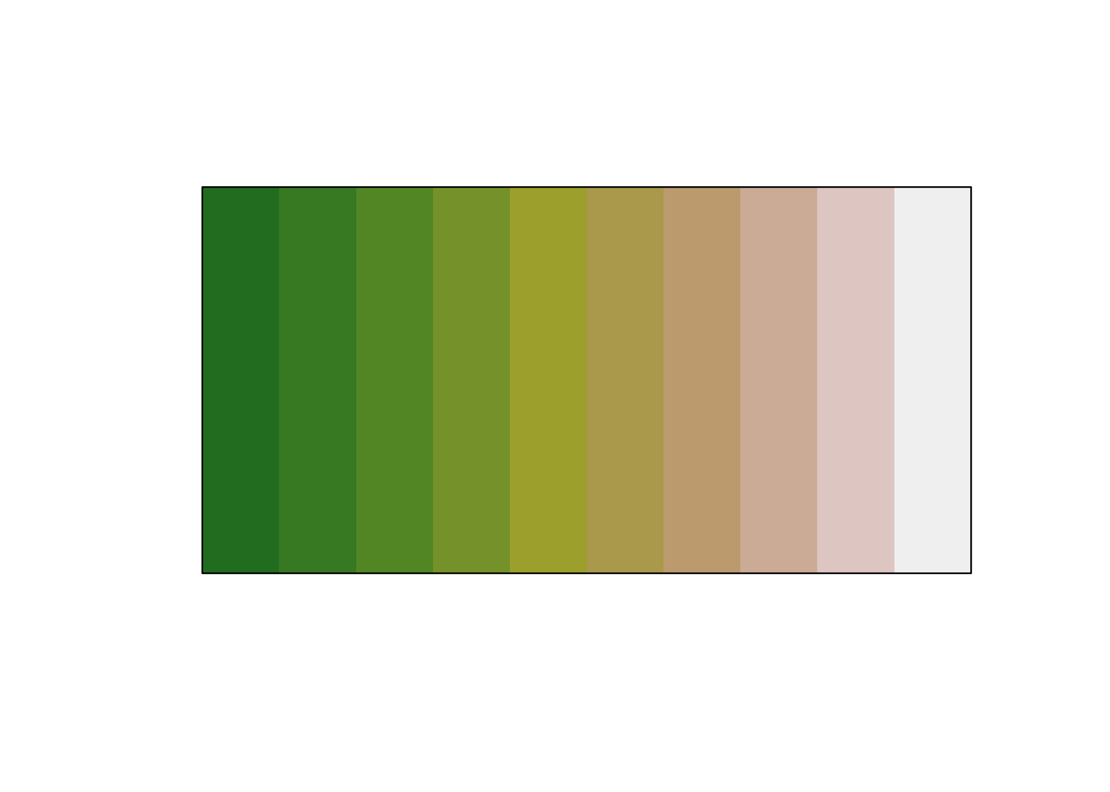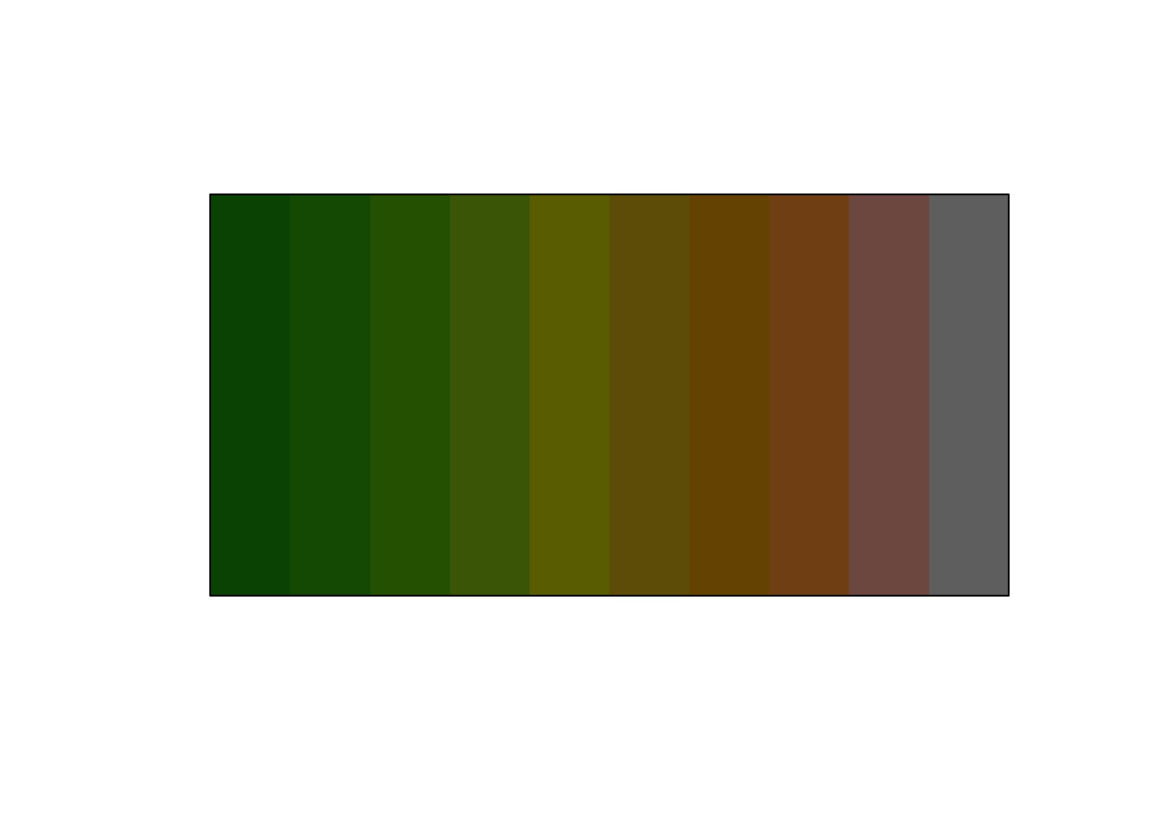 library(prismatic) library(magrittr) terrain10 <- terrain.colors(10) terrain10 #> [1] "#00A600FF" "#2DB600FF" "#63C600FF" "#A0D600FF" "#E6E600FF" "#E8C32EFF" #> [7] "#EBB25EFF" "#EDB48EFF" "#F0C9C0FF" "#F2F2F2FF" terrain_color <- color(terrain10) terrain_color #> <colors> #> #00A600FF #2DB600FF #63C600FF #A0D600FF #E6E600FF #E8C32EFF #EBB25EFF #EDB48EFF #F0C9C0FF #F2F2F2FF plot(terrain_color)
