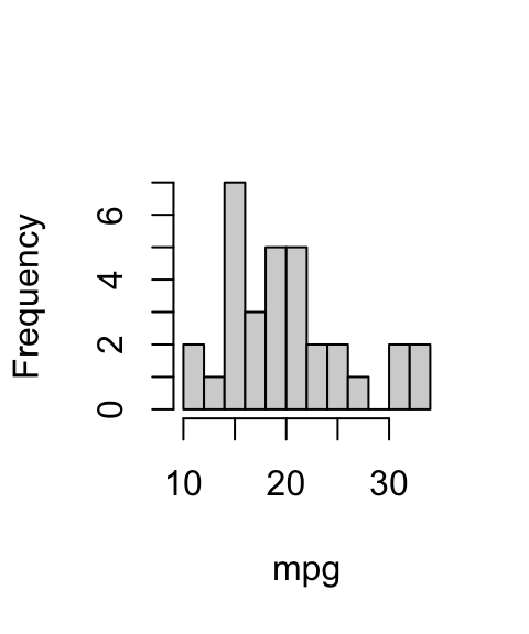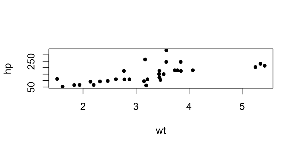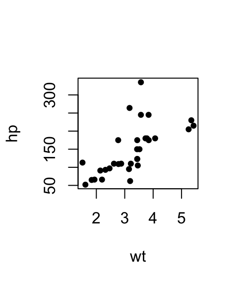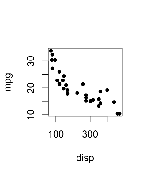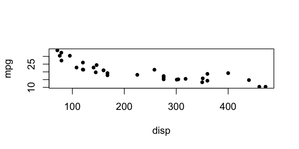 plot(mpg ~ disp, data = mtcars, pch = 19, cex = 0.7)